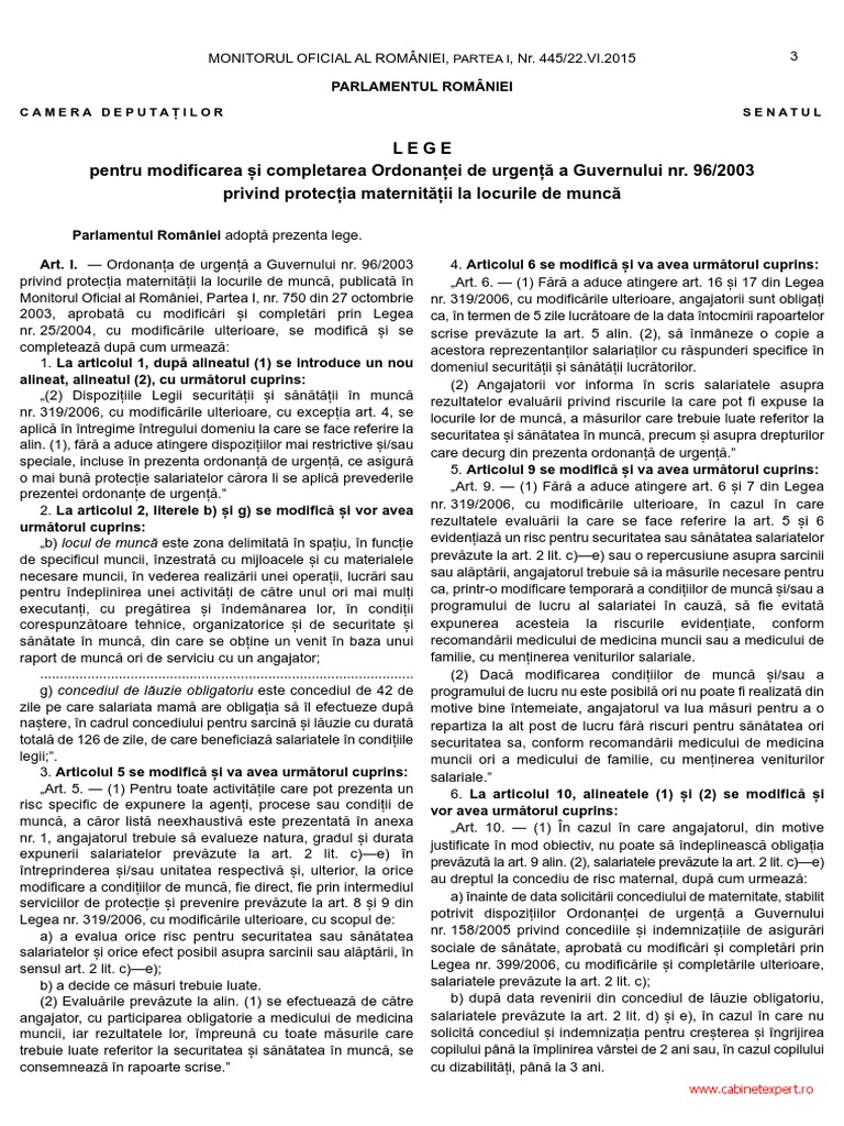 Parlamentul romaniei adopta prezenta lege. 154/2015 pentru modificarea şi completarea ordonanţei de urgenţă a guvernului nr. 96/2003 privind protecția maternității la locurile de muncă. Salarizarea instructorilor şi ucenicilor modul şi condiţiile de salarizare a instructorilor şi ucenicilor se stabilesc de guvern. 0%0% found this document useful, mark this document as useful.