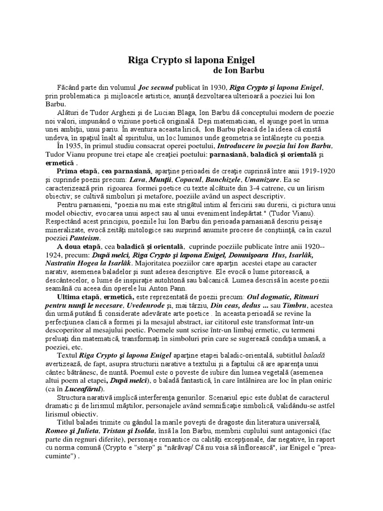 Riga crypto și lapona enigel este o poezie modernă, parte din ciclul uvedenrode, scrisă de ion barbu și publicată în 1930 în antologia joc secund. Enigel (nume ce vine de la enite erosul. „riga crypto şi lapona enigel este un poem alegoric publicat de ion barbu în perioada interbelică.