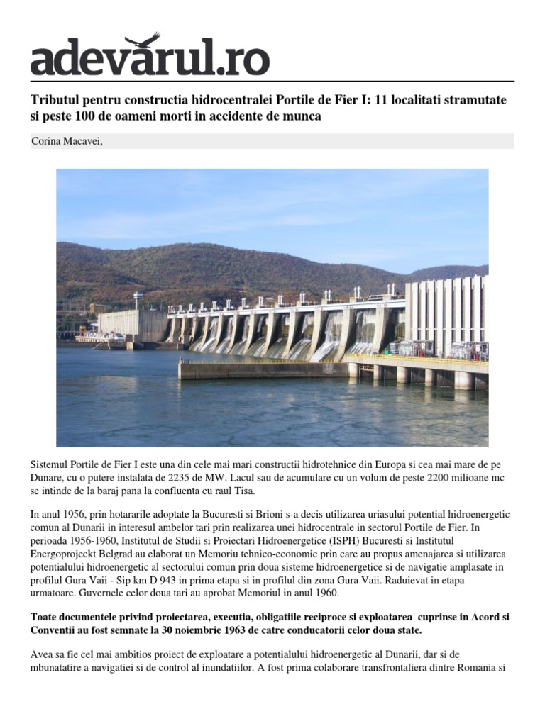 In 1956 guvernul roman si cel iugoslav au luat hotararea sa exploateze potentialul hidroenergetic al fluviului ce separa cele doua tari in zona portile de fier.